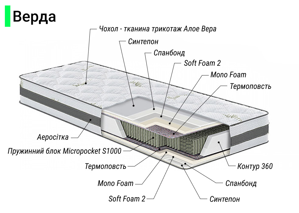 Матрац пружинний односпальний Aloe Vera Verda 90x190 см • висота 22 см (помірно-жорсткий)