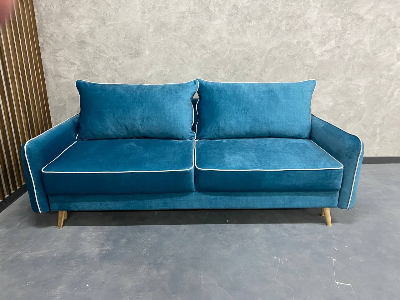 Диван виконаний у насиченому кольорі з контрастною білою окантовкою, що додає йому сучасного вигляду. Оббивка виготовлена з м’якої, приємної на дотик зносостійкої тканини, яка легко очищується та надовго зберігає первинний вигляд. Це чудовий вибір для щоденного використання як у вітальні, так і в гостьовій кімнаті.