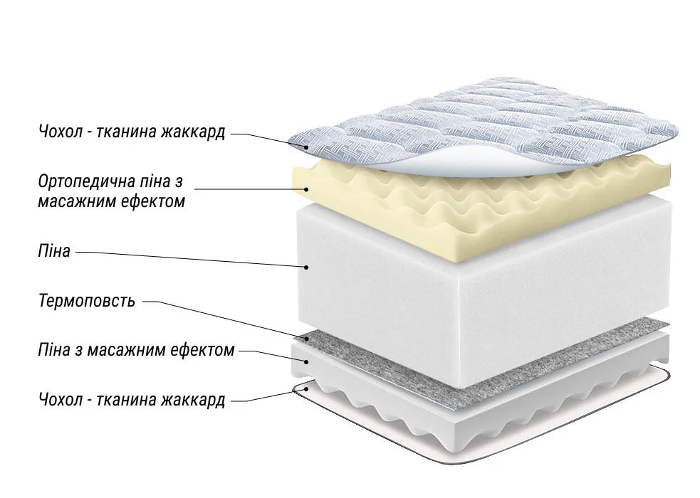 Ортопедична піна. Піна високої щільності, нетоксичний, довговічний і гіпоалергенний матеріал, який сприяє правильному розподілу тиску на різні ділянки тіла, знімає навантаження з судин і покращує кровообіг під час сну. Вона легко адаптується під контури тіла людини та швидко відновлює свою первинну форму після стискання, додає комфортності та посилює ортопедичні властивості матраца.