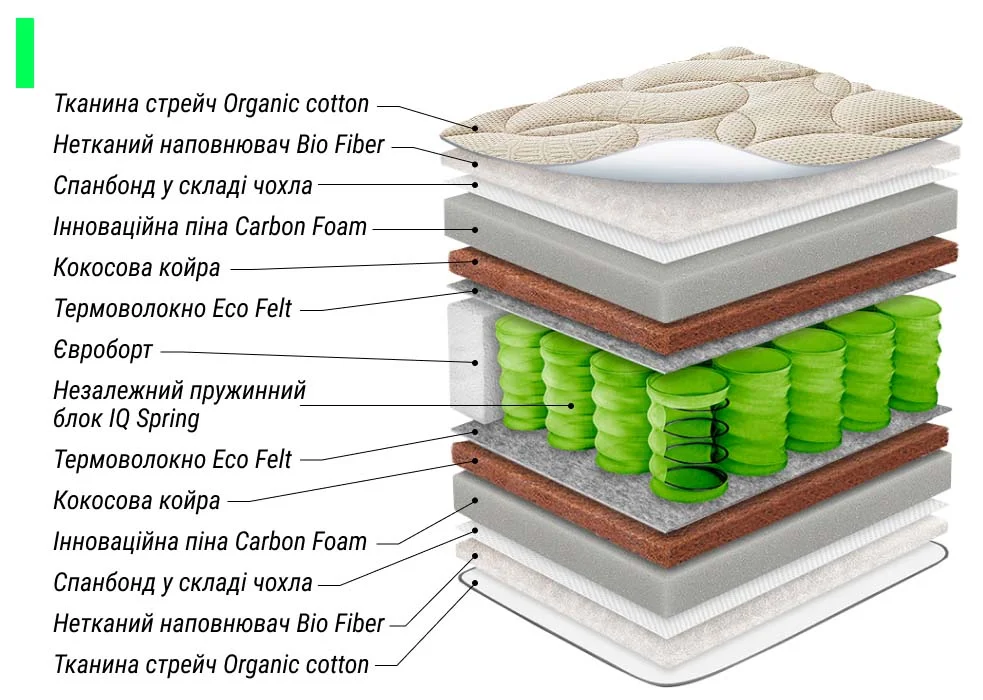 Наповненняпружини Pocket Spring, IQ Spring, євроборт 10 см, кокос, льон, піна ортопедична, термоповсть
