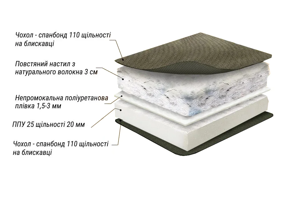 Матрас висотою 4 см з наповненням з повстяного настилу, пінополіуретану та пінополіуретанової плівки поєднує комфорт і довговічність. Повсть забезпечує міцність та захист від зносу, а пінополіуретан створює м'яку та пружну поверхню. Пінополіуретанова плівка перешкоджає вбирання вологи, спрощуючи догляд за матрацом. Його компактний розмір та легкість зручні для транспортування та зберігання. Матрац універсальний та підходить для використання на ліжку, підлозі або в похідних умовах.