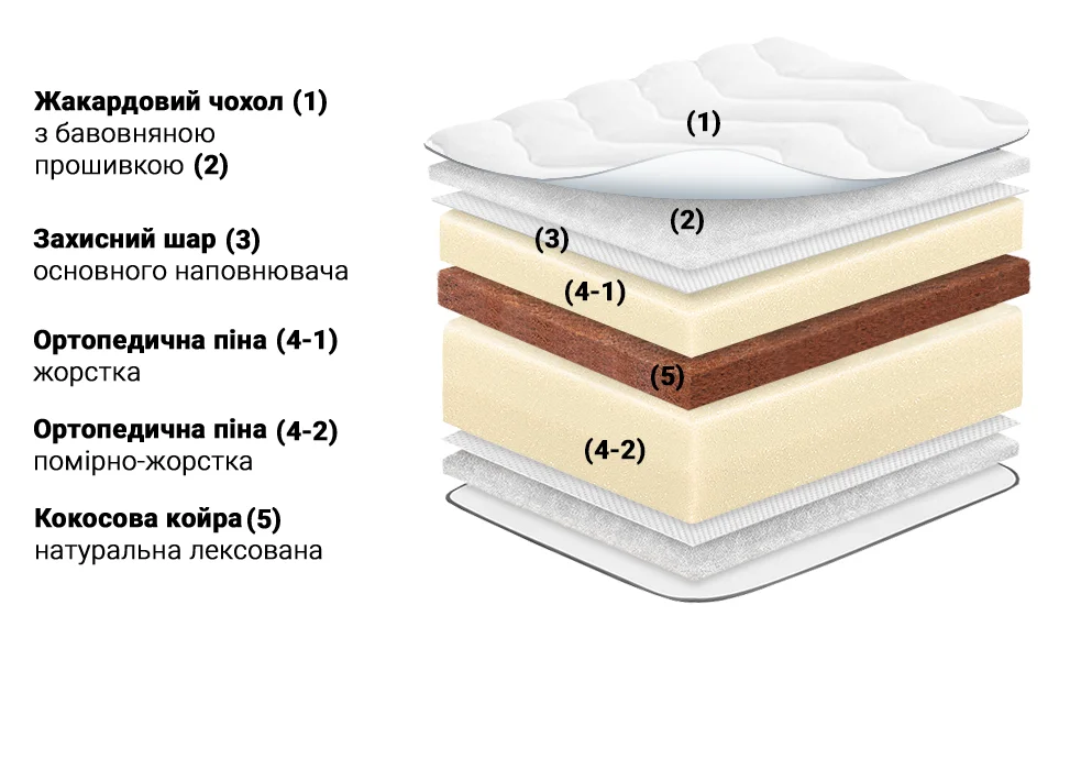 Натуральний матеріал з волокон кокосового горіха, що використовується в матрацах для надання жорсткості та покращення ортопедичних властивостей. Вона довговічна, гіпоалергенна, забезпечує вентиляцію та запобігає деформації. Підходить для дітей, людей із проблемами спини та любителів жорстких поверхонь.