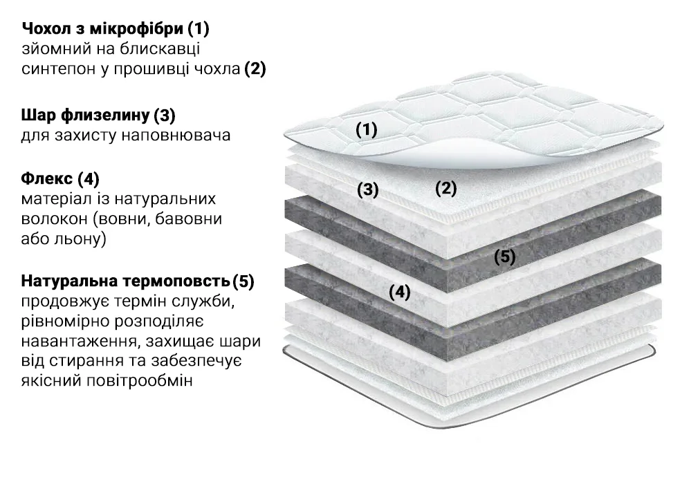 Екологічно чистий, міцний та зносостійкий матеріал, виготовлений із натуральних волокон (вовни, бавовни або льону). Він забезпечує відмінну теплоізоляцію, рівномірно розподіляє навантаження та продовжує термін служби матраца.