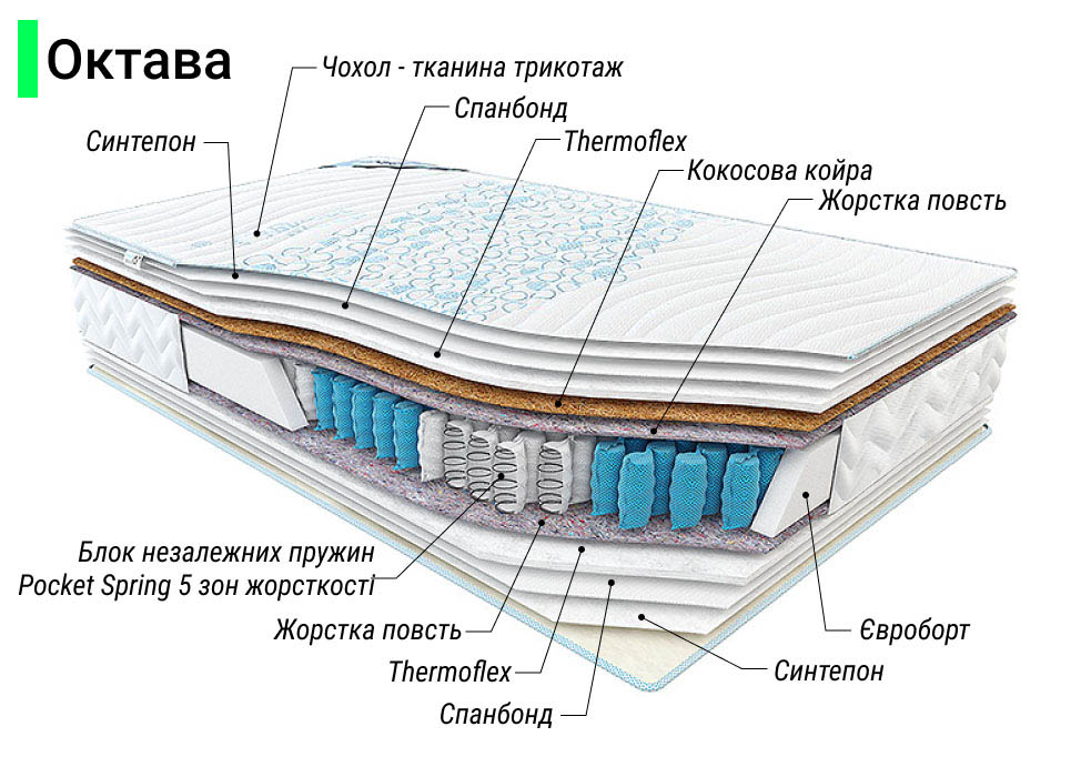 Наповненняпружини Pocket Spring, 5 зон жорсткості, кокос, термоповсть