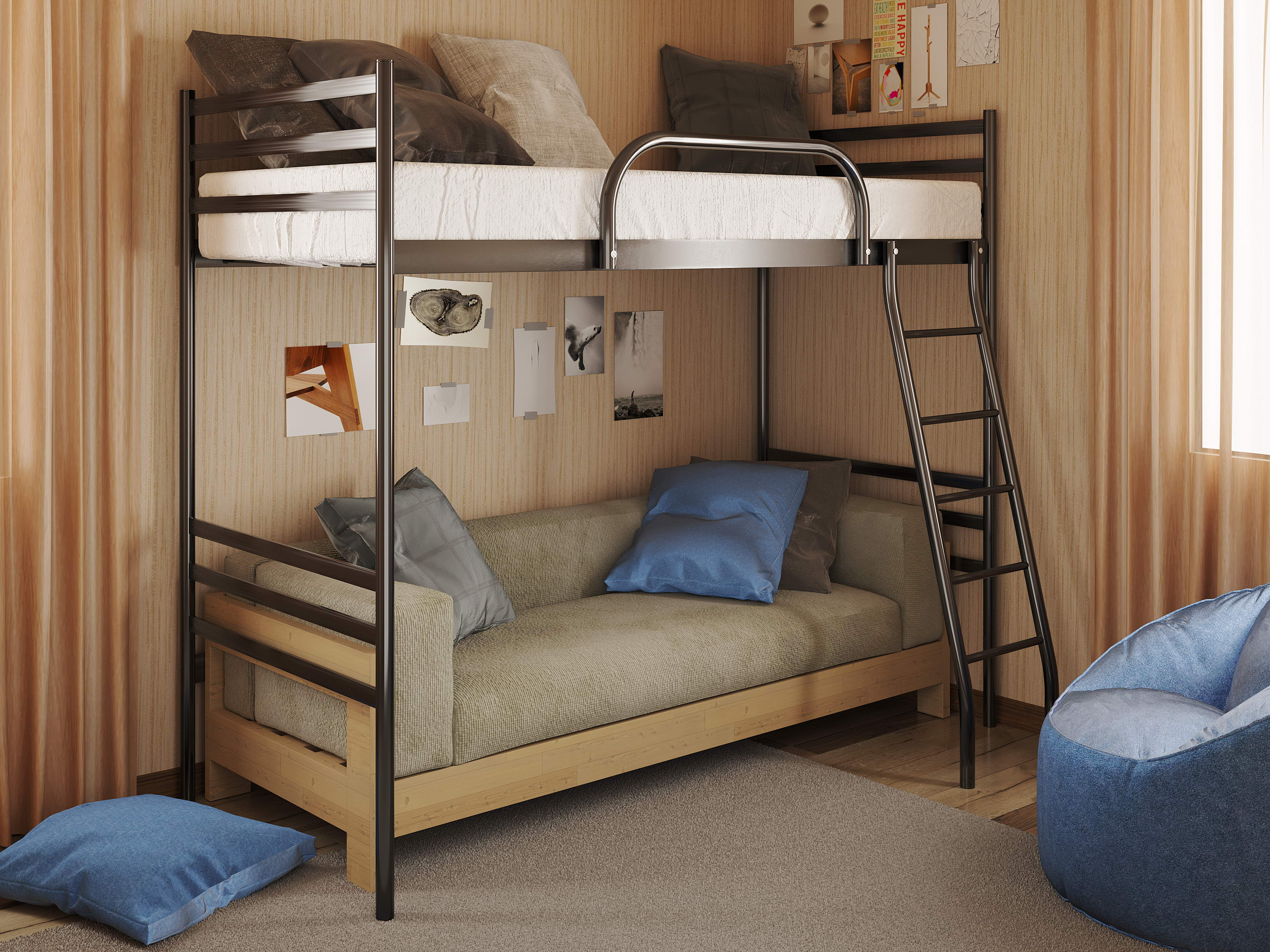 Це ліжко дозволяє ефективно заощадити простір: верхній ярус — повноцінне односпальне місце, а під ним можна розмістити диван, письмовий стіл, шафу чи робочу зону для навчання або відпочинку.