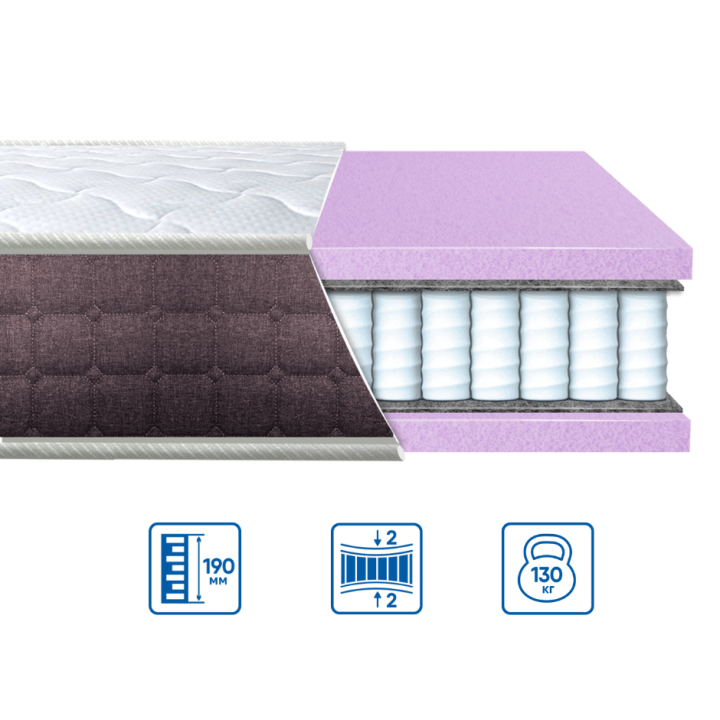 1. Піна Flexy: має здатність адаптуватися до форми тіла, що дає змогу рівномірно розподіляти навантаження по всій площі матраца. Це знижує напругу на основні ділянки, як-от плечі, стегна і нижня частина спини, сприяючи зручнішому і спокійнішому сну. Матеріал надає матрацу м'якості та покращує комфорт під час відпочинку. Після зняття тиску піна швидко повертається у свій первісний стан, що гарантує довговічність і стійкість матраца до змін форми, зберігаючи його ортопедичні властивості на тривалий термін.