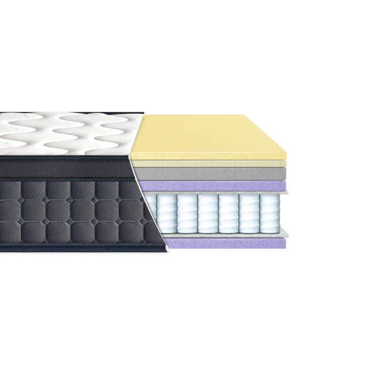 5. Посилений Pocket spring: група пружин із загартованої сталі, які розташовані окремо і запечатані в міцні кишені. Блок містить кілька сотень пружинних елементів. Оскільки кожна пружина індивідуально укладена в кишеньку, що утримує тиск у межах своєї області, це не дає змоги просідати іншим частинам матраца.