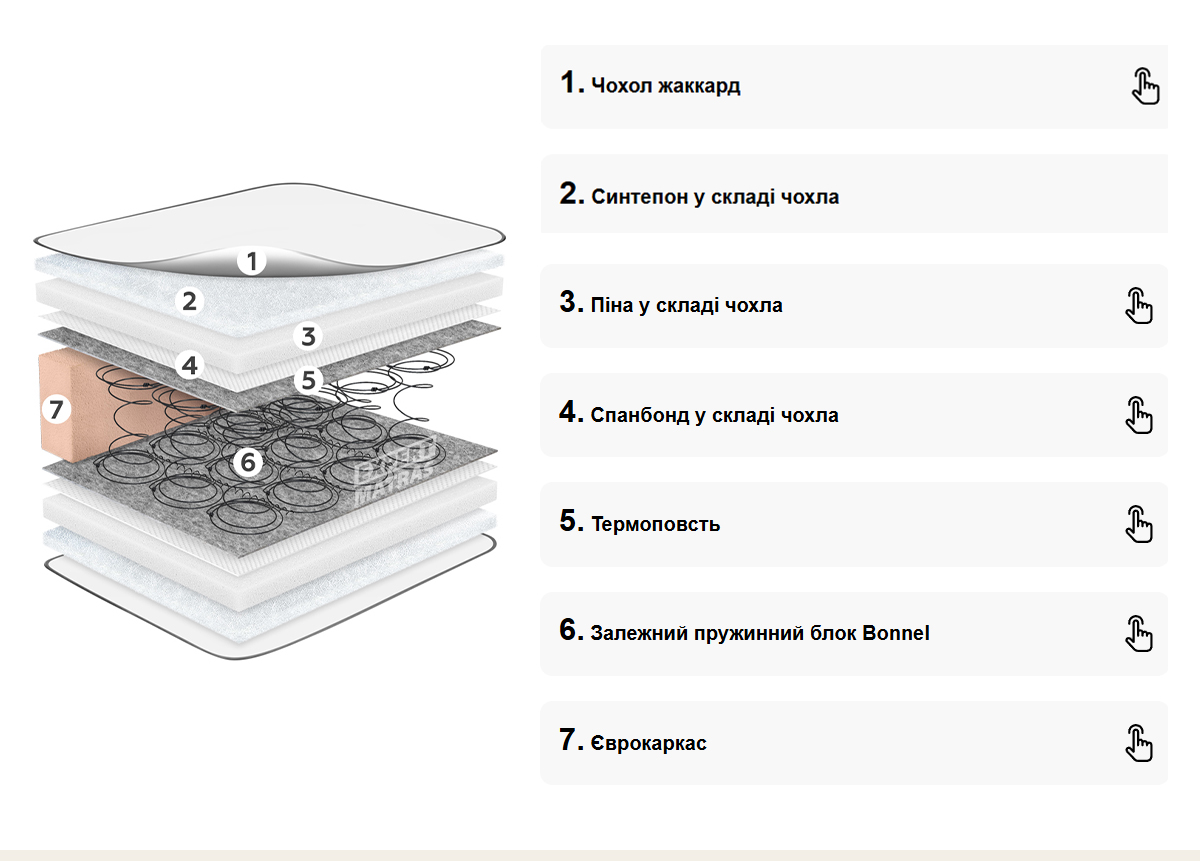 • Чохол незнімний: Забезпечує захист внутрішніх шарів матраца і зберігає його форму та естетичний вигляд.