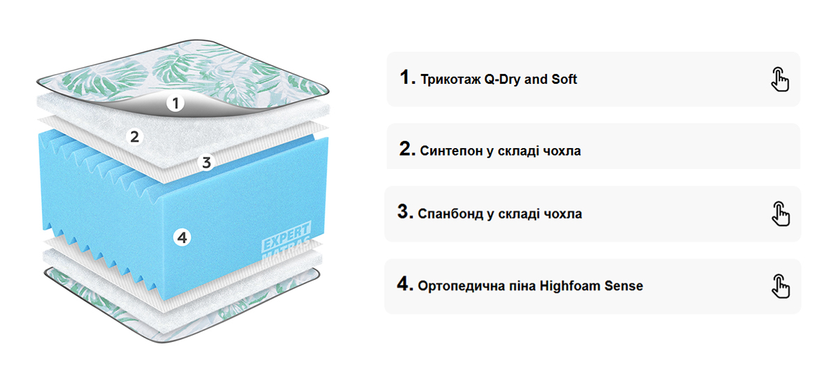 4. Ортопедична піна Highfoam Sense – забезпечує рівномірний розподіл навантаження, знімає напругу з м'язів та суглобів, сприяючи максимальному комфорту під час сну.