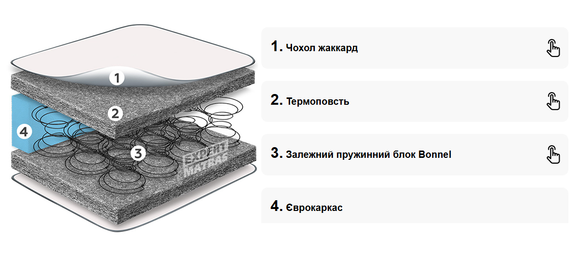 - Термоватин: Шари термоватину додають комфорту, пом'якшуючи жорсткість пружинного блоку та забезпечуючи м'який перехід між різними шарами матраца.