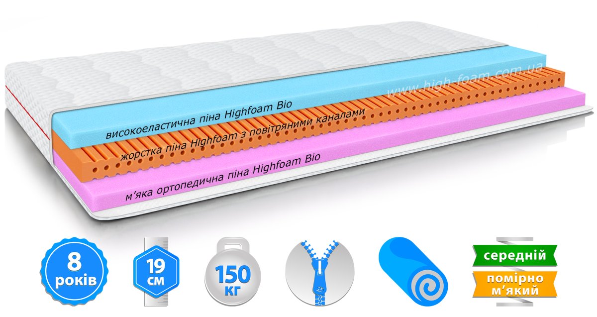 • ППУ Highfoam Bio™: Екологічно чистий матеріал, що підтримує здоровий мікроклімат під час сну.
