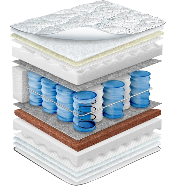 Прочный и жесткий экологичный материал, который служит барьером между пружинным блоком и мягкими слоями матраса. Благодаря высокому уровню плотности защитные свойства материала увеличены в 2 раза, это продлевает срок полезной эксплуатации изделия.