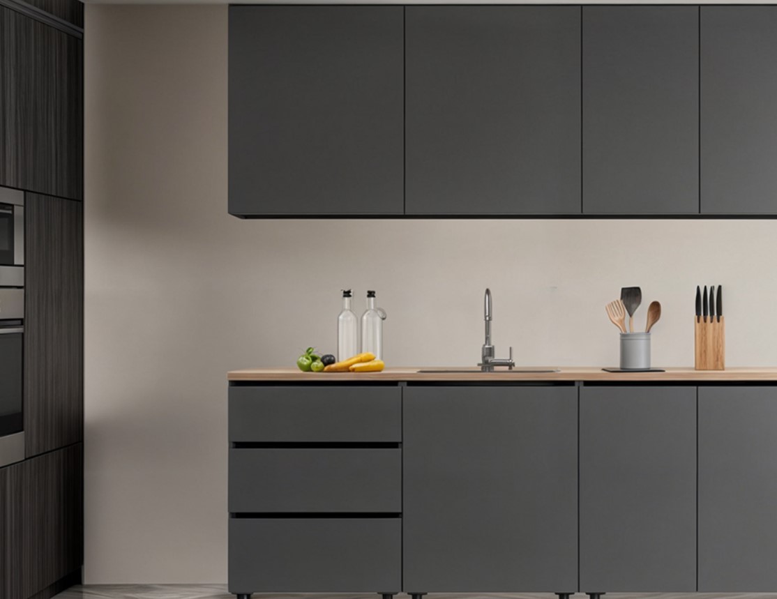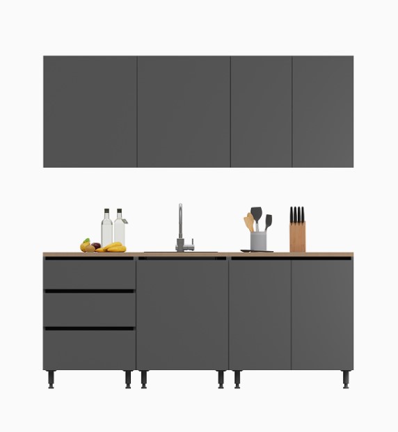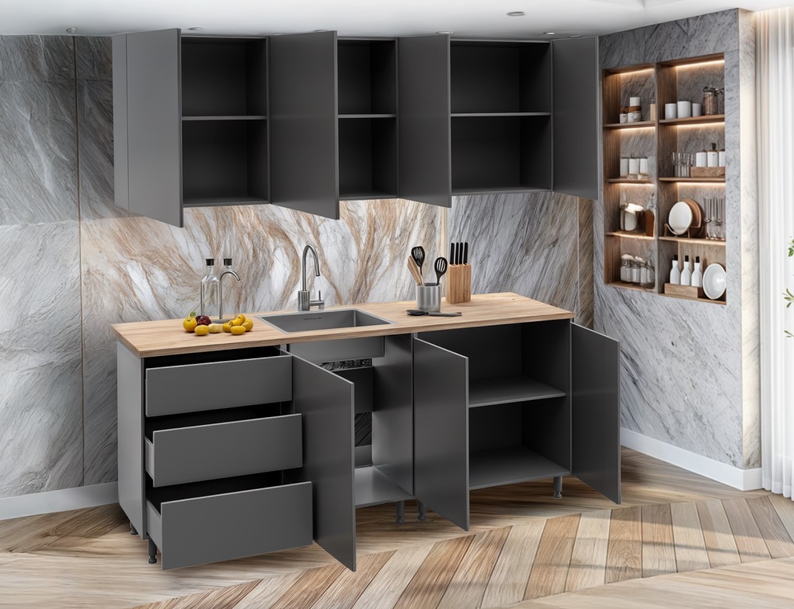- Минималистичный дизайн: Фасады без ручек открываются с торцов — удобно и стильно.