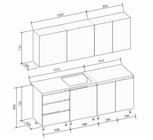 - Нижняя тумба с 3 выдвижными ящиками и отсеком под мойку: 820 х 1200 х 426 мм