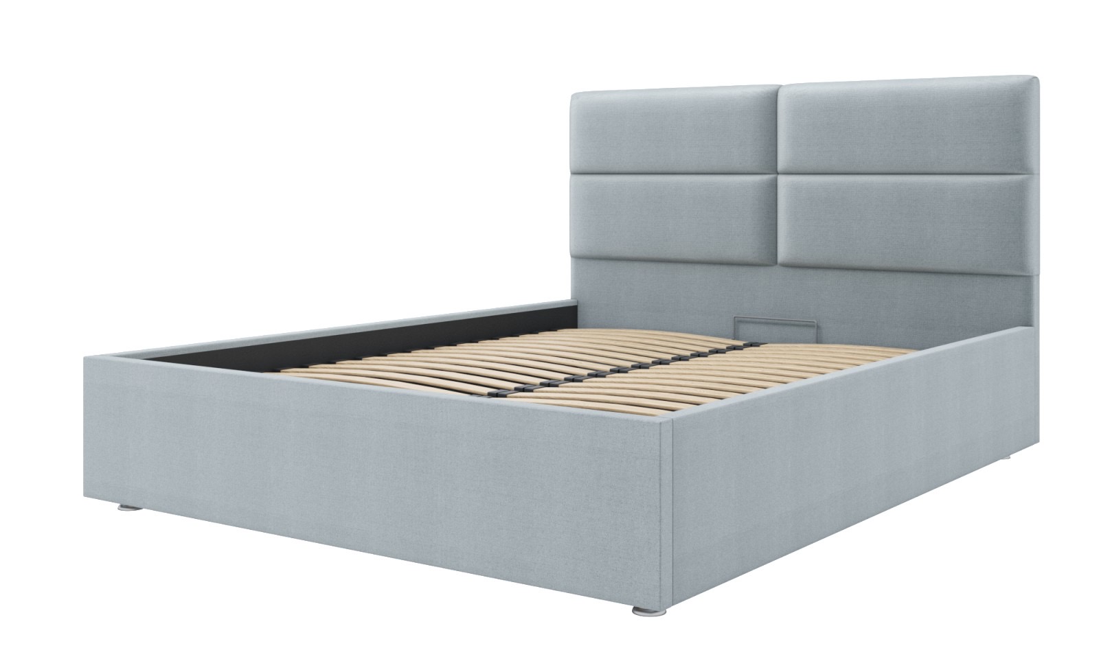 Высота изголовья составляет 110 см, высота царги — 30 см. Общие габариты: 100х216х110 см (ШхДхВ). Пластиковые ножки высотой 2 см обеспечивают устойчивость конструкции. Модель не предусматривает место для хранения, что делает ее визуально легкой и аккуратной.