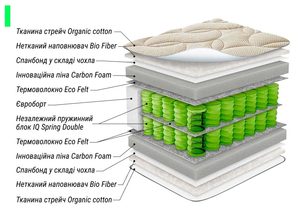Система пружин IQ Double – современный и нестандартный подход к здоровому сну, получивший широкое распространение на европейском рынке товаров. Пружинная система состоит из двух уровней, функциональные свойства которых ключевым образом отличаются. Задача первого уровня – осуществлять ортопедическую поддержку в зависимости от физиологических свойств телосложения человека. Второй уровень служит основой конструкции, а также делает матрас устойчивым к высоким нагрузкам.