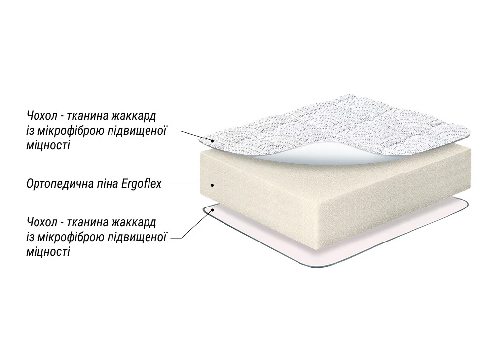 Несъемный чехол матраса – ткань жаккард с содержанием волокон микрофибры повышенной прочности, придающих поверхности мягкости. Особенное плетение ткани с добавлением эластических волокон хорошо пропускает воздух и делает чехол прочным, износостойким и гарантирует долгий срок использования.