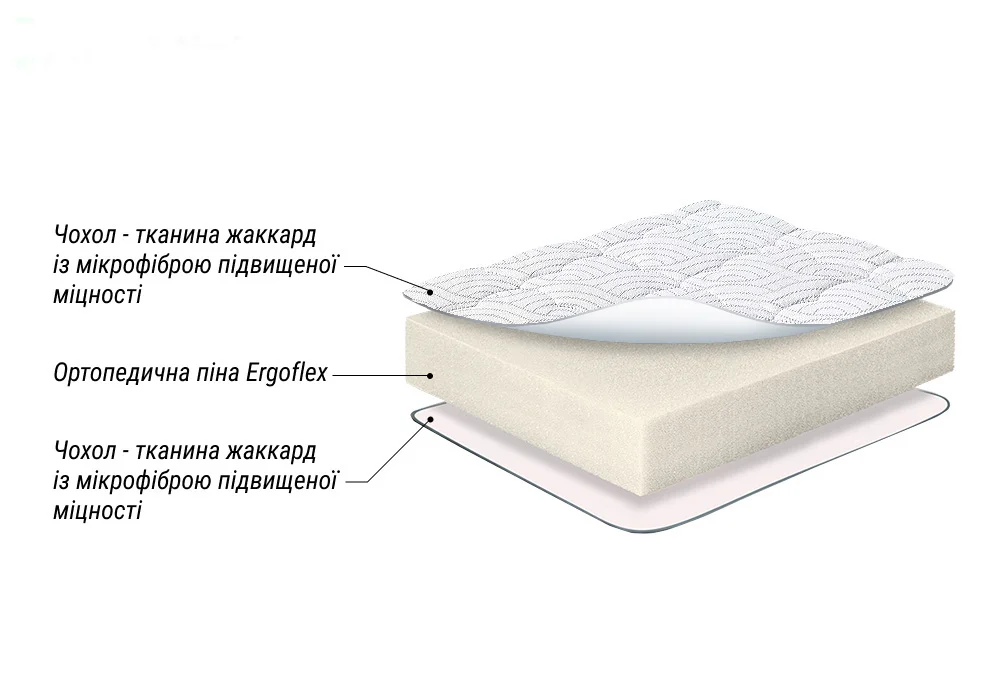 Незнімний чохол матраца - тканина жаккард із вмістом волокон мікрофібри підвищеної міцності, які надають поверхні м’якості. А особливе плетіння тканини з додаванням еластичних волокон добре пропускає повітря та робить чохол міцним, зносостійким та гарантує довгий термін використання.